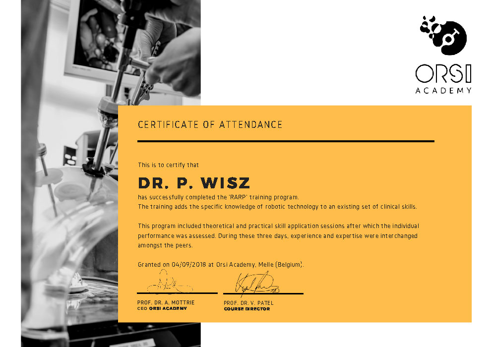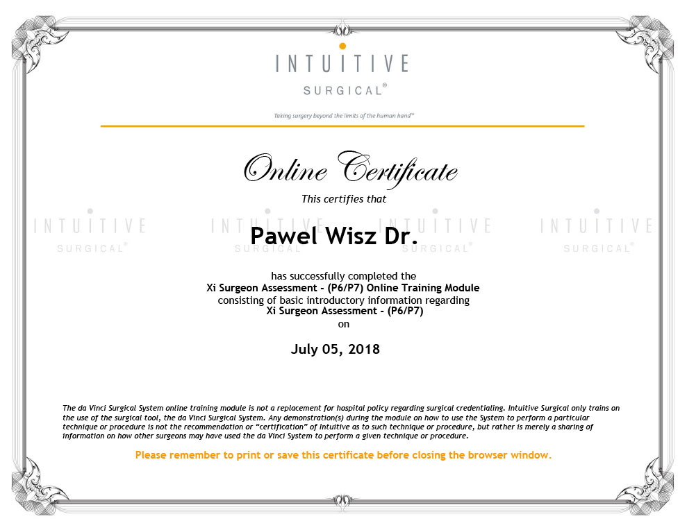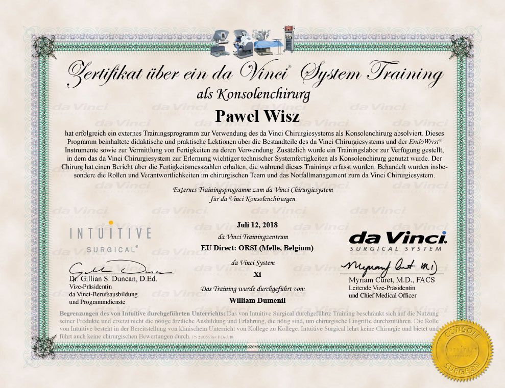 Certyfikaty w dziedzinie chirurgii robotycznej zdobyłem u boku takich autorytetów jak prof. Alexander Mottrie z Belgii podczas rocznego stażu klinicznego oraz prof. Patel z USA. Moje wieloletnie doświadczenie w leczeniu raka prostaty, w tym ponad 2 000 operacji z wykorzystaniem robota, sprawia, że pacjenci mogą polegać na mojej wiedzy i umiejętnościach.