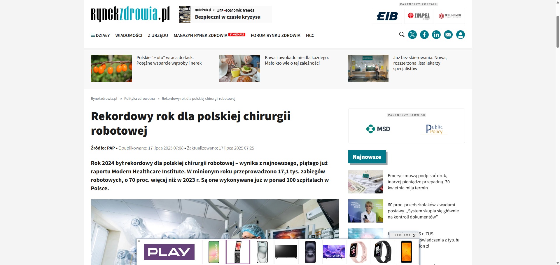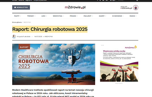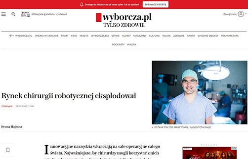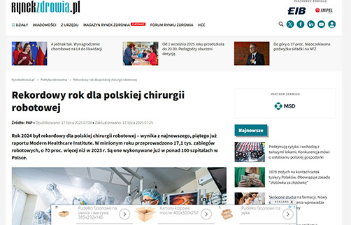 Od lat rozwijam i promuję chirurgię robotyczną w Polsce i za granicą. W 2024 roku przeprowadziłem aż 491 zabiegów robotycznych, ustanawiając tym samym nowy rekord Polski. Wynik ten został oficjalnie zarejestrowany w raporcie Modern Healthcare Institute.