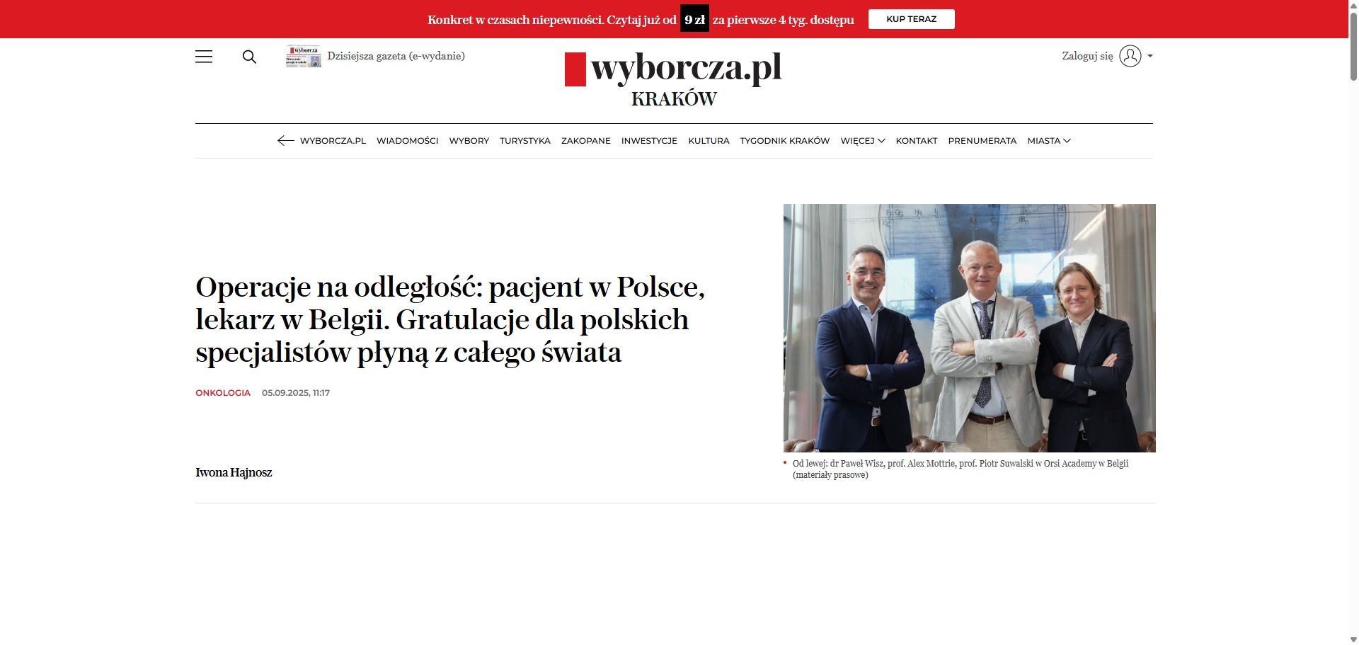 2 września 2025 roku wraz z prof. Piotrem Suwalskim mieliśmy zaszczyt przeprowadzić w Orsi Academy w Belgii pierwsze w Europie operacje robotyczne wykonane na odległość pomiędzy różnymi krajami.